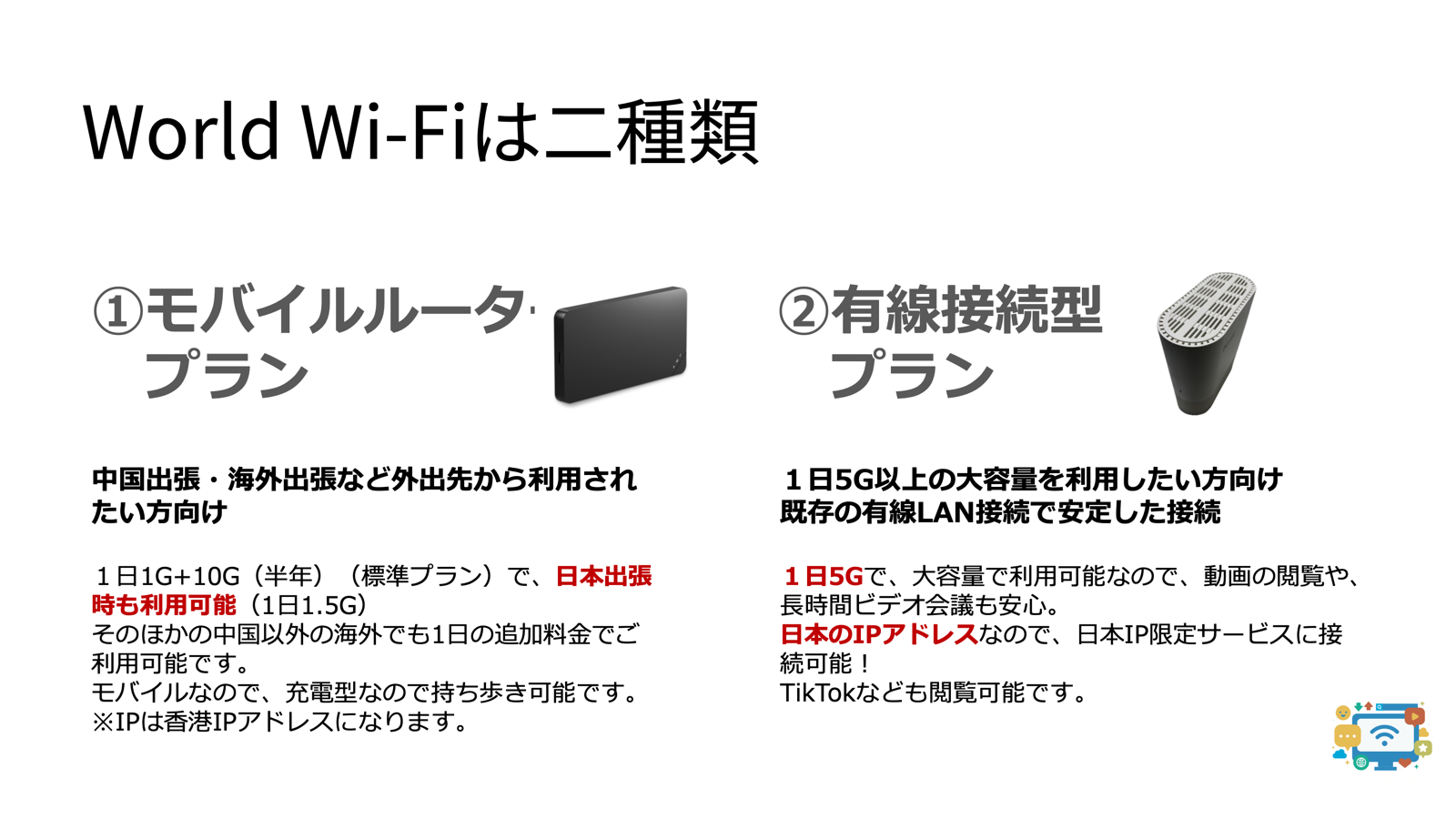 現在、中国では、情報規制があり、日本の家族や仕事とのやりとりに支障が出ることがよくあります。弊社では、日本人向けに安全な接続サービス、World-WIFIを提供しております。リスク対策として是非ご検討ください。