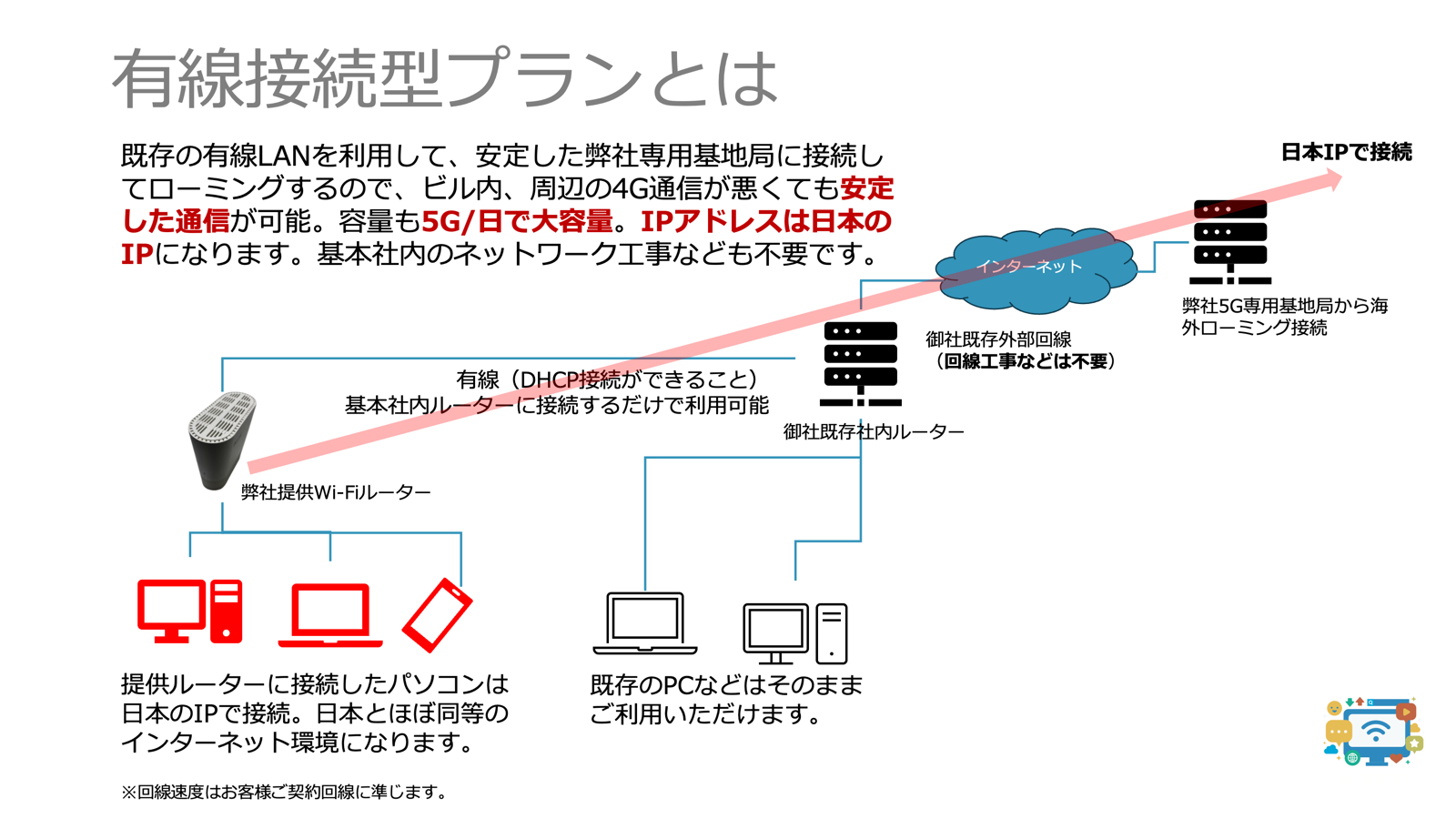 中国にいる駐在の方の、万が一の時の情報確認や、安否確認の連絡、GoogleやMicrosoft、Zoomを使用しなければならない、通信を安全に確実に行うライフラインとしてご利用いただいております。